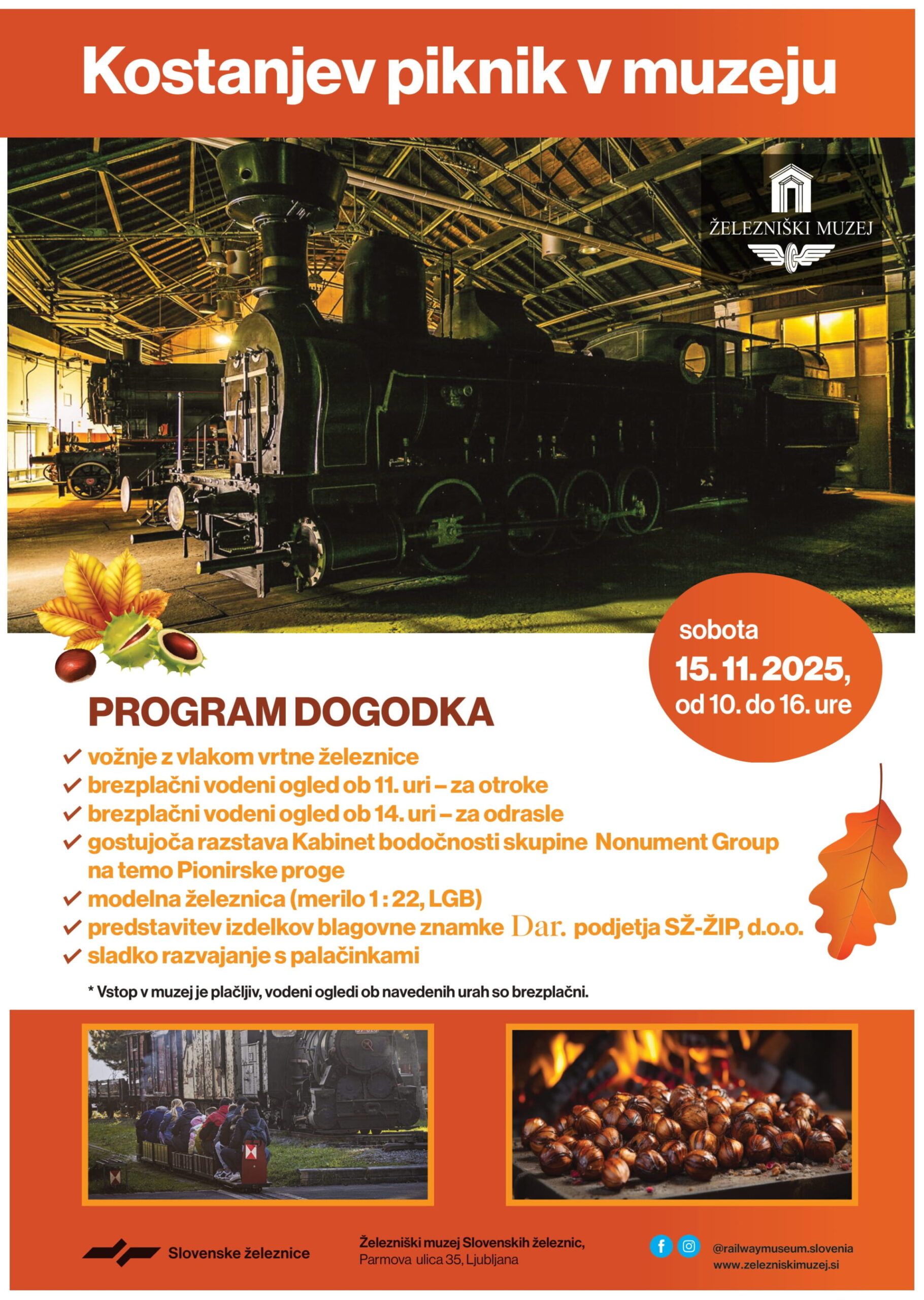 Vabimo vas, da soboto, 15. novembra 2025, preživite v edinstvenem ambientu muzeja na Parmovi ulici 35 v Ljubljani, kjer se bodo združile jesenske dobrote, prijetna družba in svet železniških zgodb. Med 10. in 16. uro boste lahko ob vonju pečenih kostanjev, palačink in dišečega čaja raziskovali našo bogato muzejsko zbirko parnih lokomotiv, vagone, signalne naprave in druge dragocene železniške naprave.