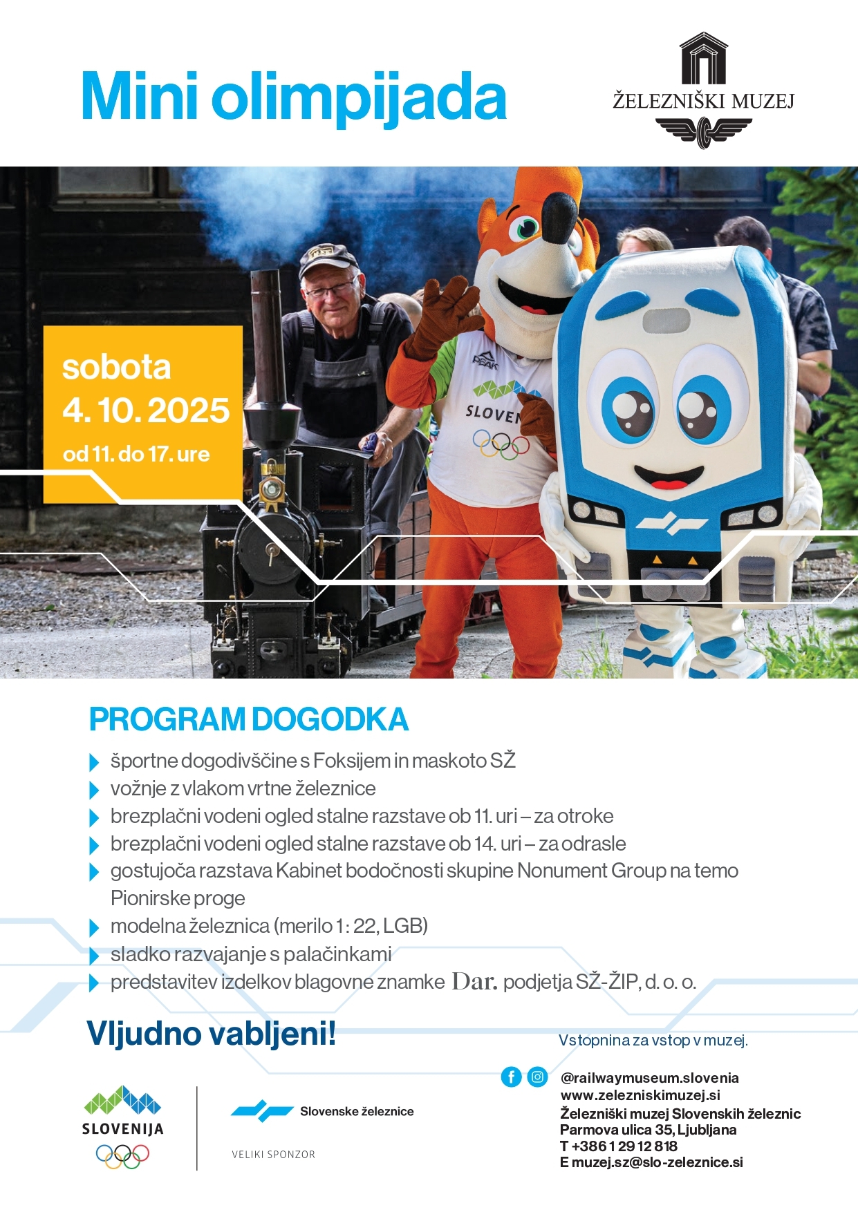 Prireditev, ki povezuje olimpijce, druge ljubitelje športa in železničarje, ne bi bila čisto prava, če se je ne bi udeležili tudi naši krasni maskoti. Najbolj zagrizeni navijač slovenskih športnikov, lisjak Foksi, ter največji ambasador sodobnih železnic v Sloveniji, maskota Slovenskih železnic, bosta navduševala otroke in jim pomagala začutiti športni duh v Železniškem muzeju.
